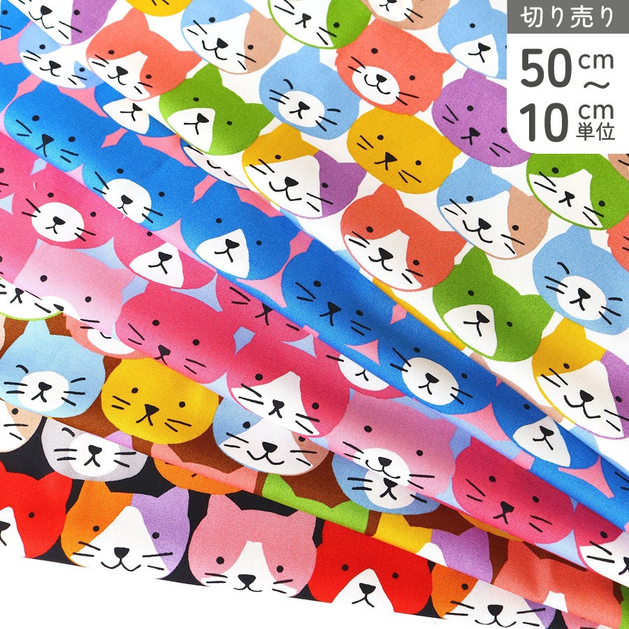 他の画像を見る AS3700-24 生地 オックス生地 ねこ柄 カラフル キャット フェイスプリント コットン 布 入園入学 通園バッグ レッスンバッグ 巾約106cm 最低単位50cm~10cm単位の切売 ¥ 115 税込 お気に入りに登録する