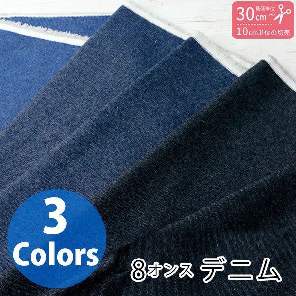定番の無地のデニム(ジーンズ)生地です。デニムとしては薄手で家庭用ミシンでさくさく縫えます。