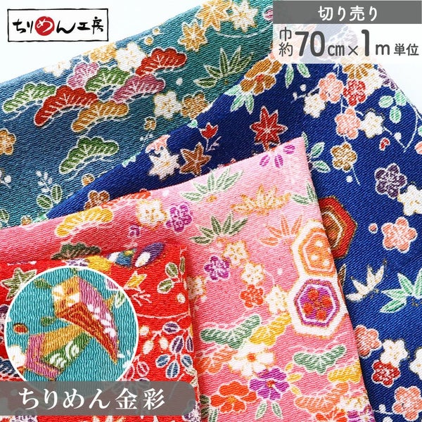 6. ちりめん 生地 金彩 約70cm×1m単位 切り売り レーヨン100% 七宝つなぎと松竹梅 金彩メーター売り つまみ細工 古典柄 和柄 小物 手芸