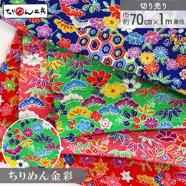 6. ちりめん 生地 金彩 約70cm×1m単位 切り売り レーヨン100% 松竹梅メーター売り つまみ細工 古典柄 和柄 小物 手芸