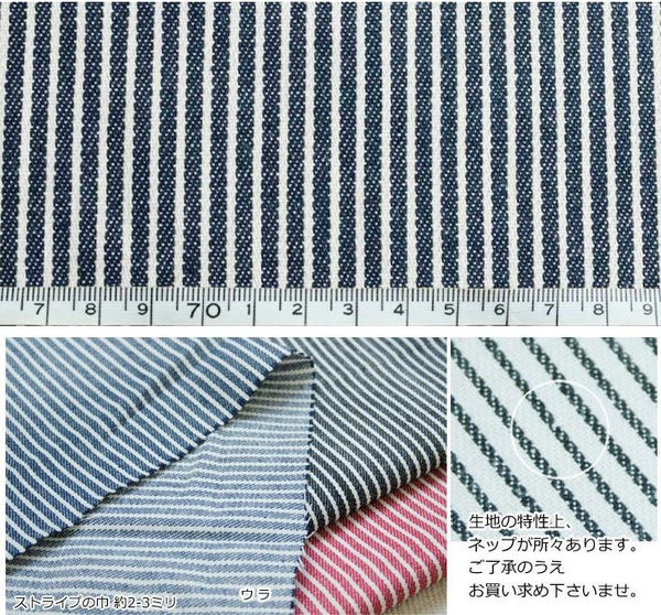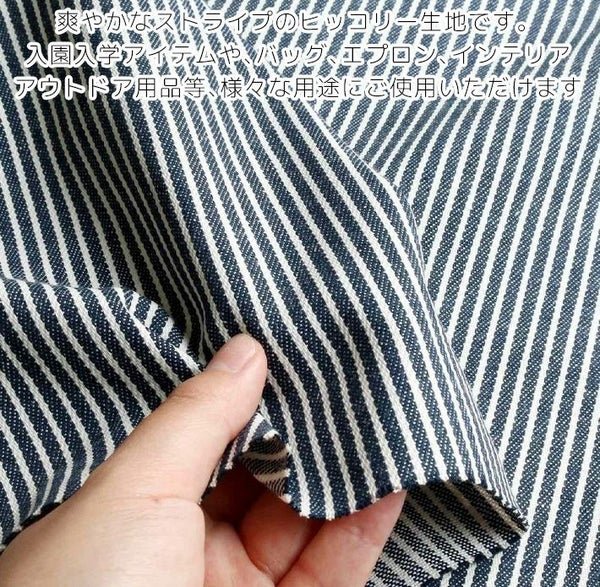 カジュアルでかっこいい雰囲気のヒッコリー生地です。家庭用ミシンでさくさく縫えます。ヒッコリーらしいしっかりとした質感で、入園入学グッズや、バッグ、エプロン、インテリア用品等、多用途にお使いいただけます。