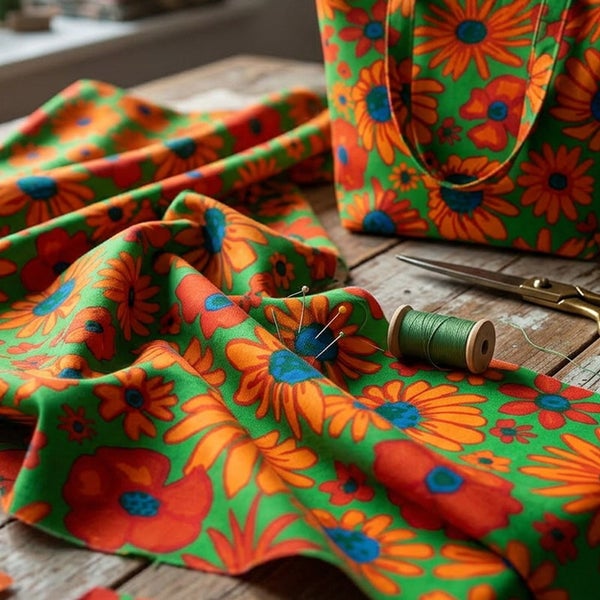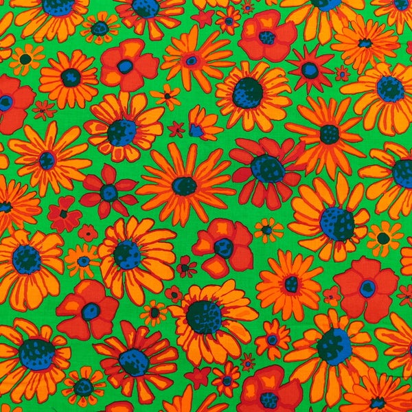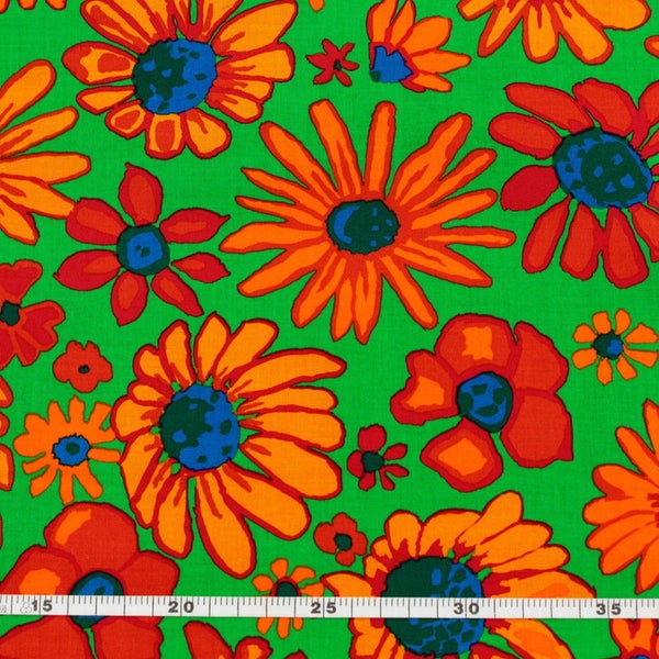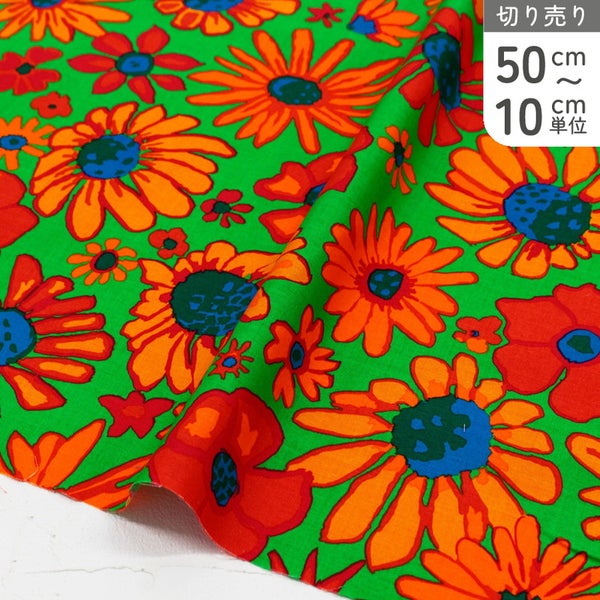 輸入生地 USAプリント生地 グリーン地 オレンジ ビタミンカラーフラワー レトロポップ USAプリント生地 Kaffe Fassett ケイフ・ファセット FreeSpirit フリースピリット 巾約110cm 最低単位50cm~10cm単位の切売 | 手芸材料のネットショップ つくる楽しみ.com