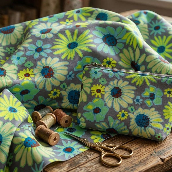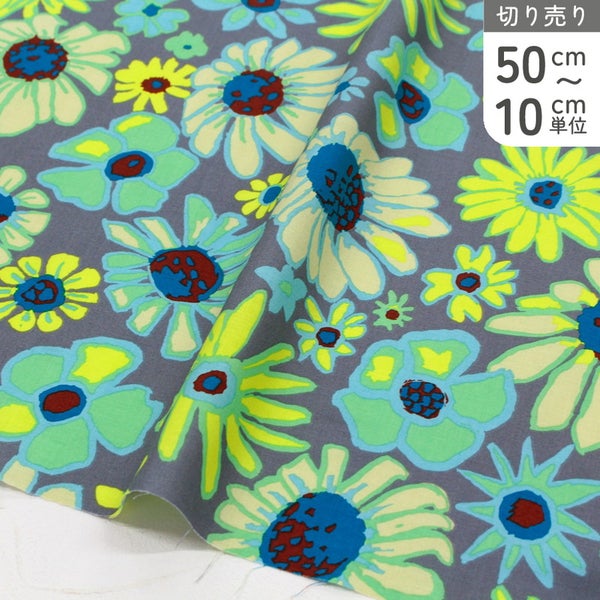 5. 輸入生地 USAプリント生地 グレー地 水色黄色 くすみフラワー ナチュラルポップ USAプリント生地 Kaffe Fassett ケイフ・ファセット FreeSpirit フリースピリット 巾約110cm 最低単位50cm~10cm単位の切売
