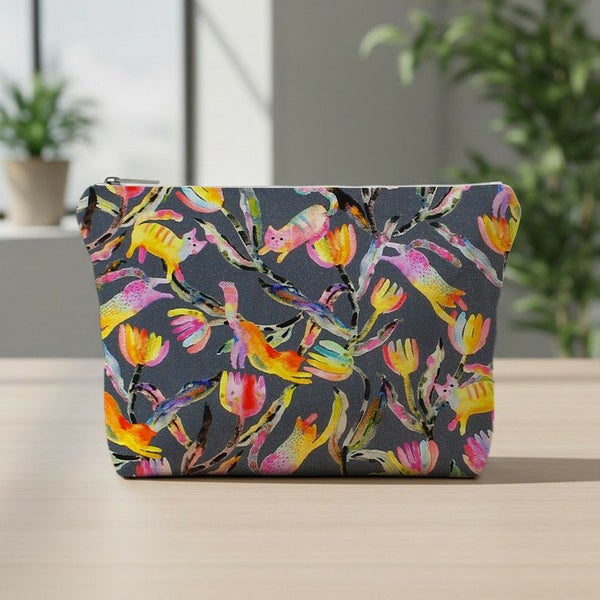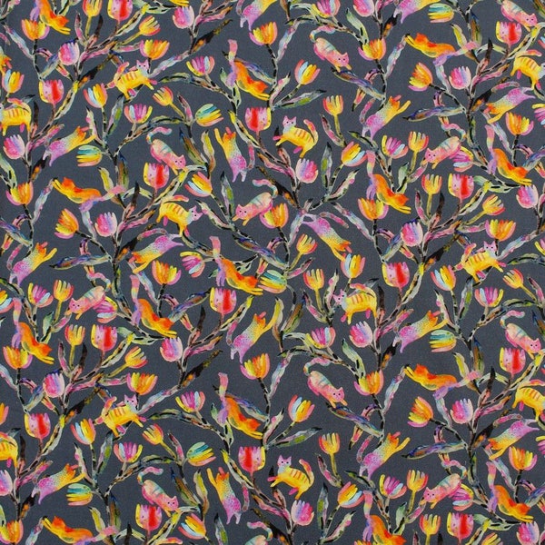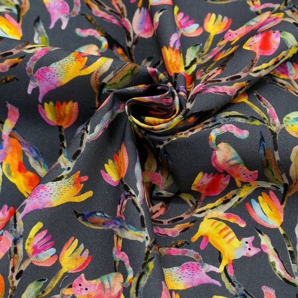 輸入生地 生地 インポート カラフル植物とネコ ROBERT KAUFMAN ロバートカフマン USAプリント 巾約110cm インテリア 正規輸入品 珍しい柄 バッグ最低単位50cm~10cm単位の切売