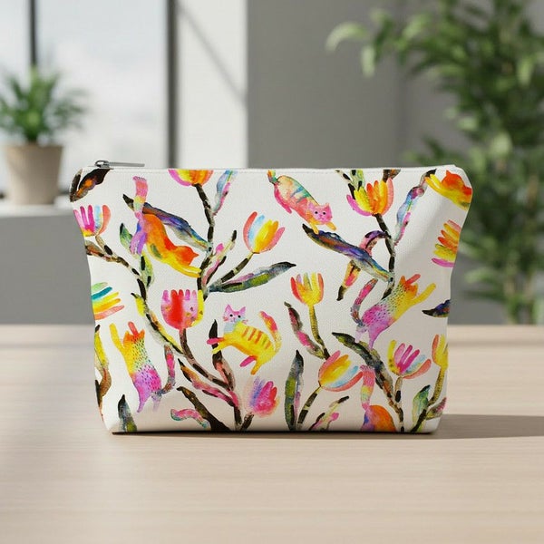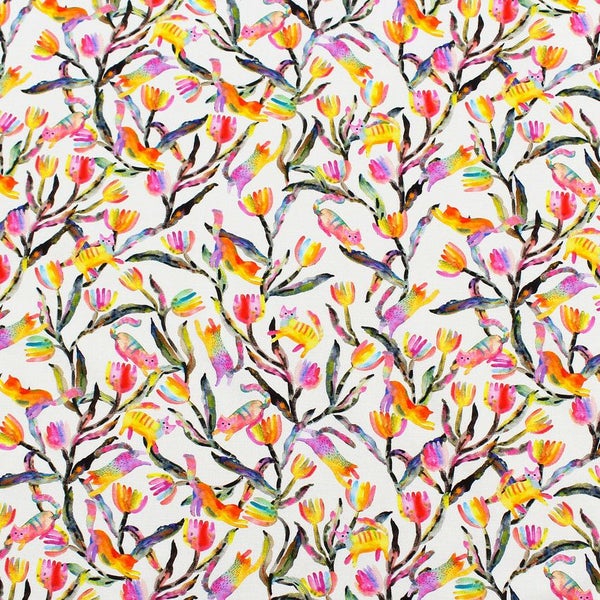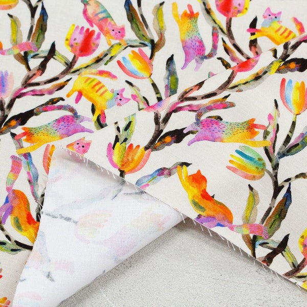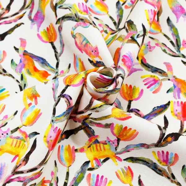 輸入生地 生地 インポート カラフル植物とネコ ROBERT KAUFMAN ロバートカフマン USAプリント 巾約110cm インテリア 正規輸入品 珍しい柄 バッグ最低単位50cm~10cm単位の切売