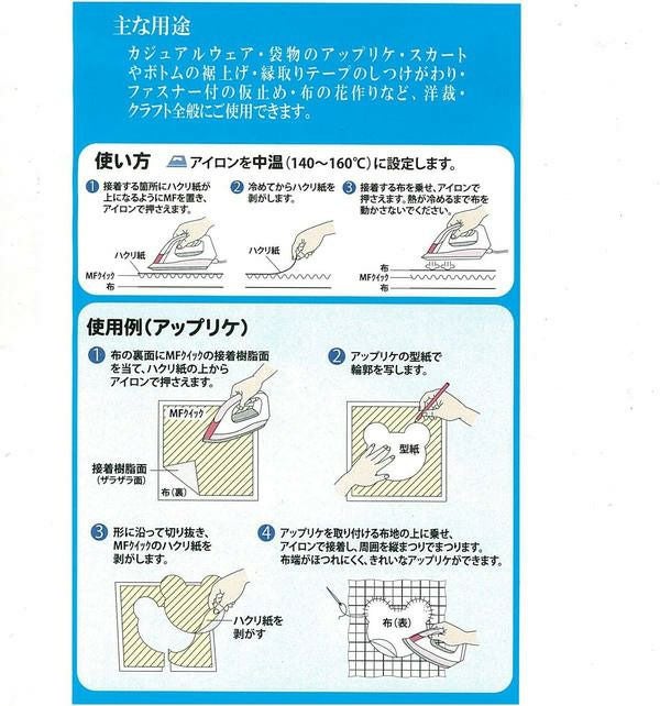 MF(Melt Fuse とけて くっつく)は離型紙の付いた簡単アイロン接着シートです。