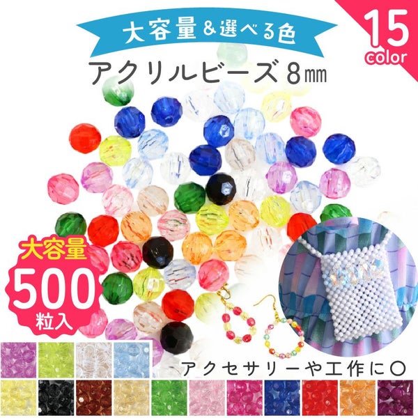 ビーズ (お徳用500個) アクリルビーズ 8mm クラフトビーズ カラフル 透明 クリア プラスチックビーズ