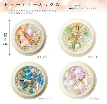 ■入り数:約1.8g/1個 ■4色セット ■樹脂製/白丸プラケース入り ストーン・パールなどキレイめパーツをランダムにミックス