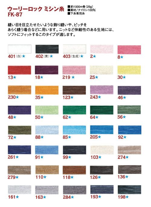 ニットなど、伸縮性のある生地や、巻きかがりの場合はウーリーロックミシン糸がオススメです。