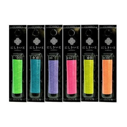 パッと目を引くブライトカラーの糸とネオンフィルムを撚りあわせたシリーズ。インパクトがあるので少量使いでも効果抜群。極細の糸なので好みの本数に引きそろえて使えます