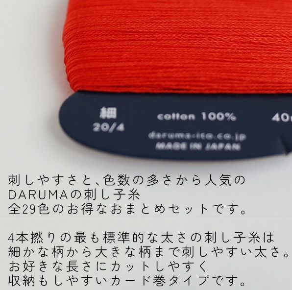 お値段もちょっぴりお得な、ダルマの刺しゅう糸、全29色セットです。 ■サイズ約40m