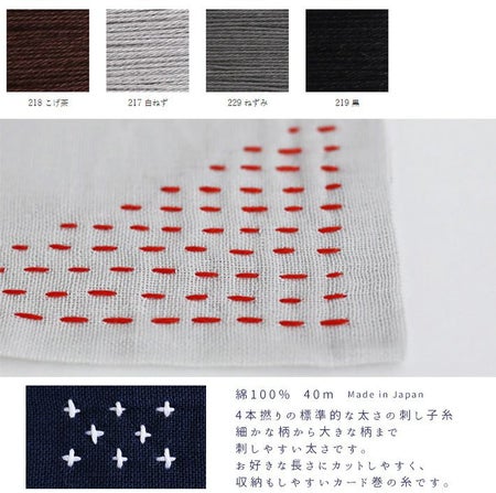 4本拠りの標準的な太さの刺し子糸。細かな柄~大きな柄までさしやすい太さです。お好きな長さにカットしやすく、収納しやすいカード巻の糸です。