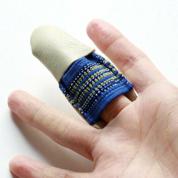 ソフトで指にフィットし、外れにくいシンブル。 青と黄色の刺繍を施したデザインもポイントです。 ※金亀リトルハウスのレザーシンブル(品番:LH431001)がリニューアルしました。 ■サイズ/内径約20mm/長さ73mm/巾28mm ■素材/牛革・ゴム ■ゴムの部分を内側にして使うとなじみます。