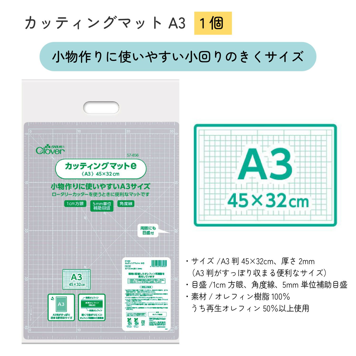 クロバー CLOVER カッティングマット A3 ロータリーカッター 45mm セット 手芸 裁縫 洋裁 道具 パッチワーク キルト 型紙 小物づくり 裁断 方眼付き エコ 再生素材 左右対応 コンパクト