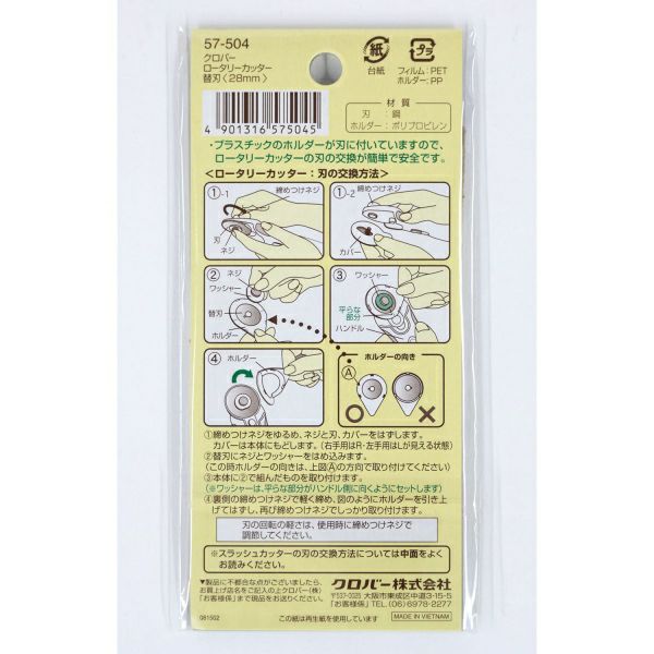 クロバーロータリーカッター(57-502)、クロバースラッシュカッター(57-505)の専用替刃。クロバーロータリーカッターの刃の交換が安全に簡単にできます替刃にホルダーが付いていますので、直接刃に触れずに交換ができ安全です。(クロバーロータリーカッターの場合)
