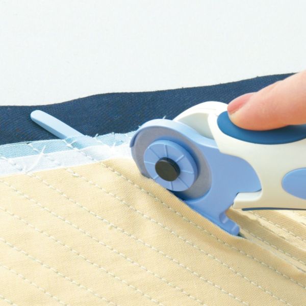 刃を確実に固定するラチェット機構。押すときには刃が回転しないラチェット機構。刃が回転しないので布がガイドと刃の間にくいこまずに重ねた布がきれいに切れます。