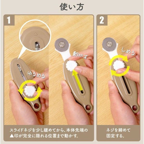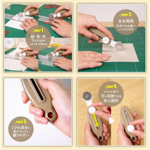 手の中に収まるサイズなので扱いやすく、紙、革、布、フィルムがこれ1本でスパッと切れます。スライド式で刃を収納できる安心設計、持ち運びも便利です。