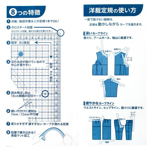緩やかなカーブラインはウエストライン、ヒップライン、股ぐりに最適なカーブ型です。 定規1本で様々な線が描けるため、原型や雑誌のトレースパターンなど