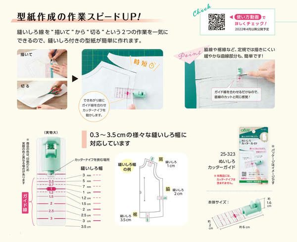 縫い代付きの型紙づくりに便利な時短ツール。縫いしろ線を「描いて」から「切る」という2つの作業をいっ気にできるので、縫いしろ付きの型紙が簡単に作れます。