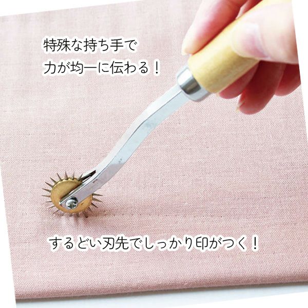 型紙に沿って先端を転がしながら薄手の生地に直接しるしをつけることができます。