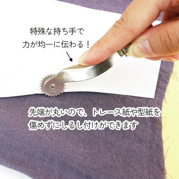 型紙に沿って先端を転がしながら薄手の生地に直接しるしをつけることができます。