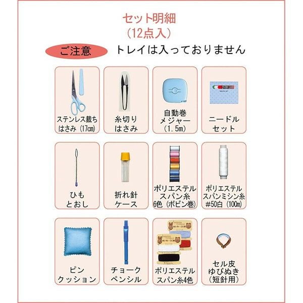 洋裁はさみ17cm、糸切はさみ、メジャー、ニードルセット、ピンクッション、チョークペンシル、ひもとおし、折れ針ケース、スパン糸6色(ボビン巻)、スパンミシン糸#50白、スパン糸4色、セル皮指ぬき・・・以上12点