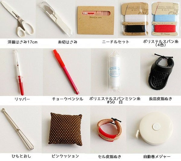洋裁はさみ17cm、糸切はさみ、メジャー、ニードルセット、ピンクッション、チョークペンシル、リッパー、ひもとおし、スパンミシン糸#50白、スパン糸4色、セル皮指ぬき、長皿皮指ぬき・・・以上12点