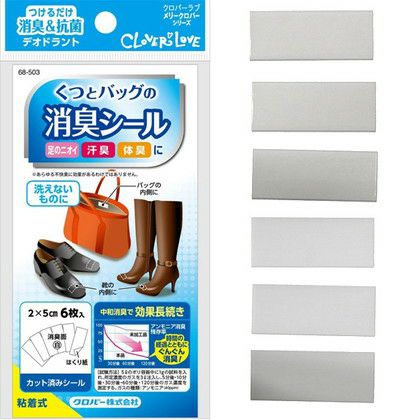 革靴やブーツ、スニーカーなどの履物やスポーツバッグ、小型スーツケース、ペットのお散歩バッグなど気になる臭いを中和して軽減する強粘着タイプの消臭シールです。