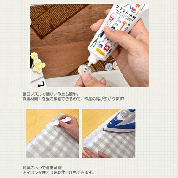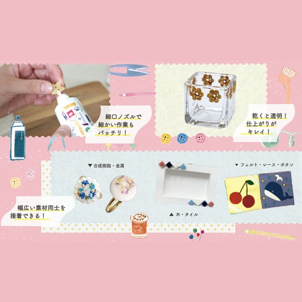 布、木、紙、金属等を強力接着できるため、1本で多様なクラフトに対応できます。
