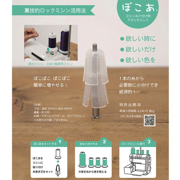 ミシン糸1本を、簡単に小分けできるアタッチメントでポコポコと糸巻きを作れる「ぽこあ」です。