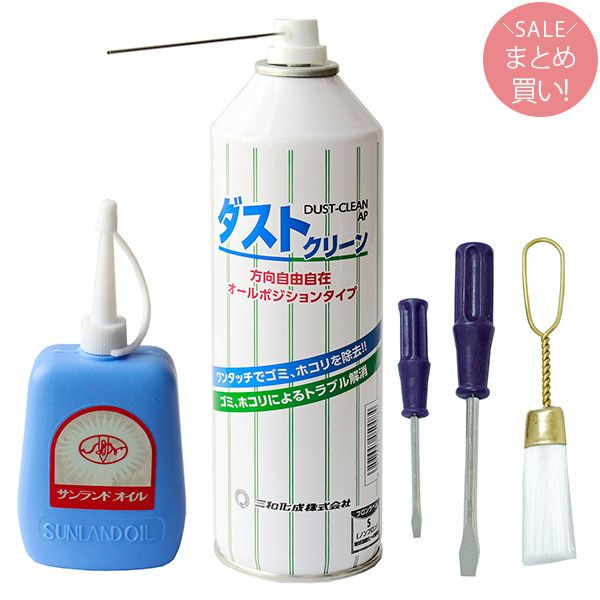 マイナスドライバー大小各1本、リントブラシ、ミシンオイル、エアスプレー(ダストクリーン)