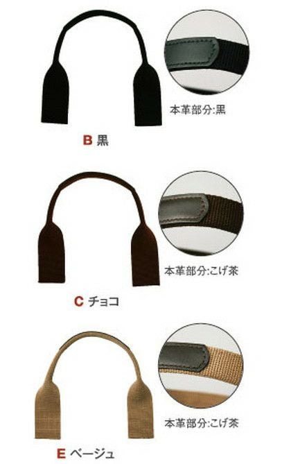 織りの持ち手の持つ部分にレザーをが縫い付けられたハンドルです。何にでも合わせられるスタンダードカラーをラインナップ。