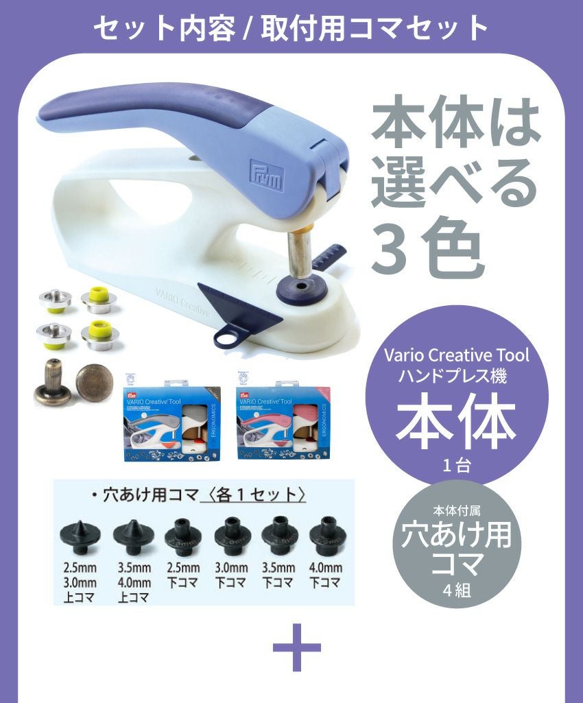 他の画像を見る PRM673131-BTSET-A ハンドプレス機 家庭用+片面ハトメ コマ&補充用 3点セット プラスナップ ハンドプレス プリム(Prym) VARIO Creative Tool 選べるプレス機 ¥ 27,500 税込 ¥ 26,950 税込 お気に入りに登録する