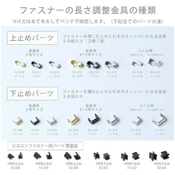 | ファスナーの品番の頭の数字 例えば 「3、4、5」が、番手になります。 例)4LFG20 金属 ファスナー ゴールド → 4番の金属ファスナーの上どめ、下どめが合います。 |