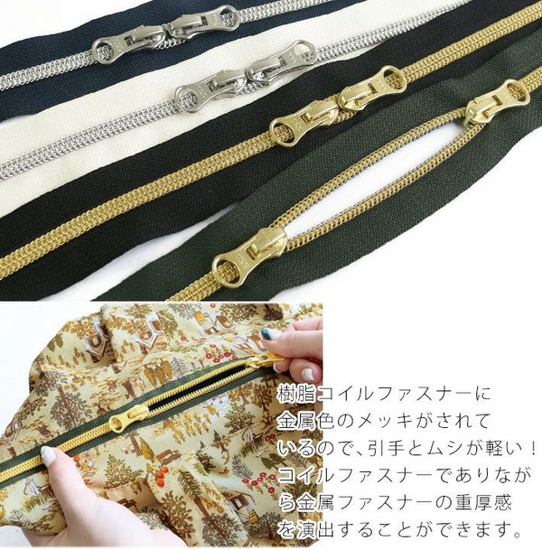 樹脂コイルファスナーに金属色のメッキがされています。