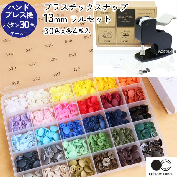 プラスチックスナップ ボタン 13mm 30色 ケース付 と 打ち機セット CHERRY LABEL チェリーレーベル サングリップ SG | 手芸材料のネットショップ つくる楽しみ.com