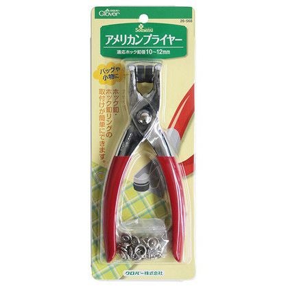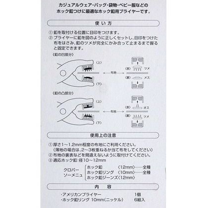 10mm~12mmのホック釦・ホック釦リングを簡単に取り付けられるプライヤーです。ホック釦リング10mm(ニッケル)6組付き。