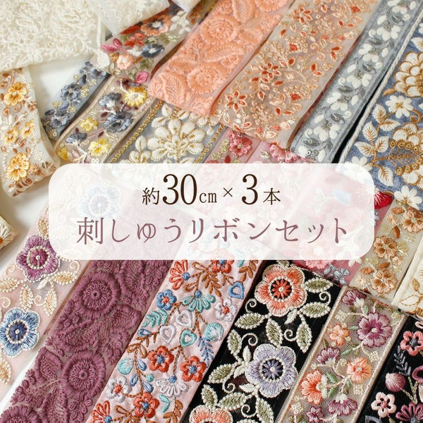 レシピ付 インド刺繍リボン 約30cm×3本 アソートセット インド製 刺しゅう リボン インド 刺しゅう リボン おしゃれ 花柄 ハンドメイド ショルダー ストラップ 手芸 スマホ アクセサリー りぼん│ つくる楽しみ