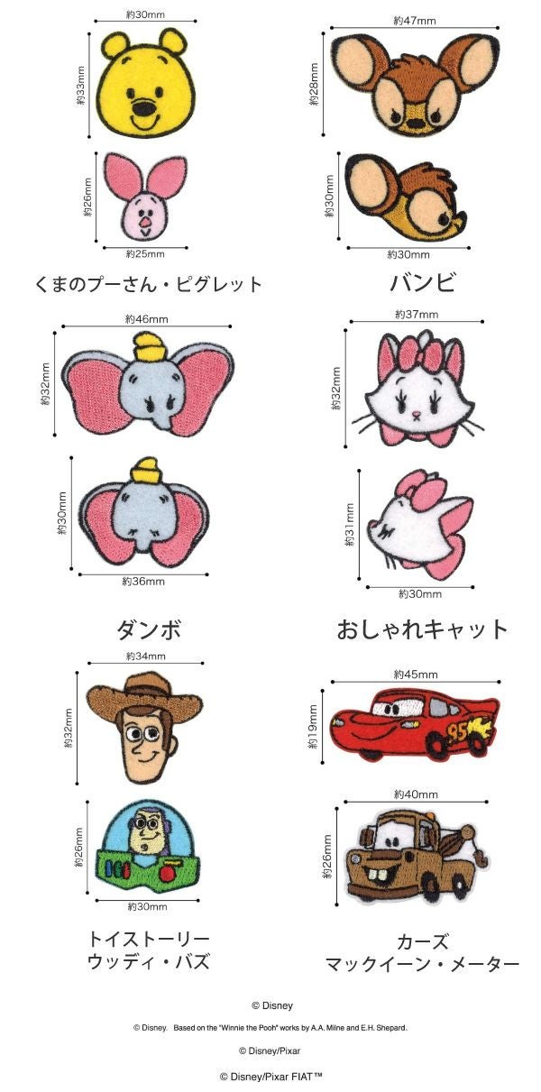 ワッペン アップリケ ディズニー くまのプーさん プー バンビ ダンボ おしゃれキャット トイストーリー カーズ 各1枚入り シール ・ アイロン 接着 両用 入園入学 パイオニア