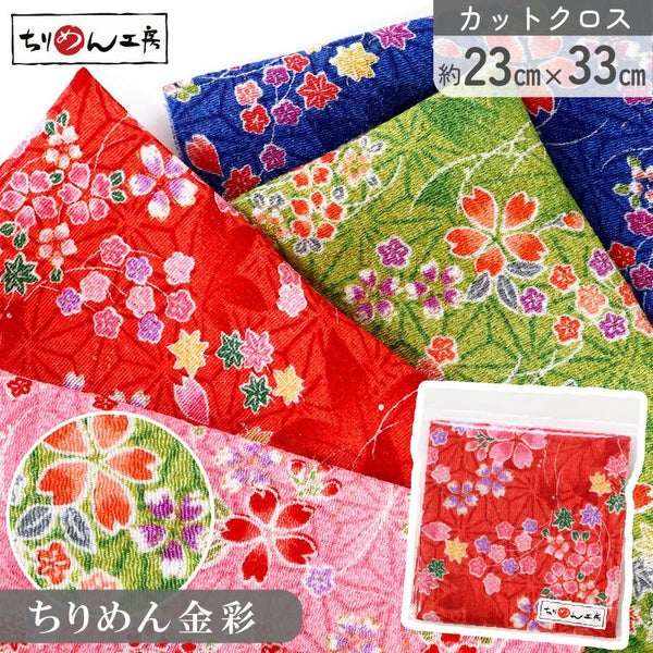 GH42-CUTC ちりめん カットクロス 生地 金彩 レーヨン100% 約23×33cm 桜と紅葉 金彩 はぎれ つまみ細工 古典柄 和柄 小物 手芸