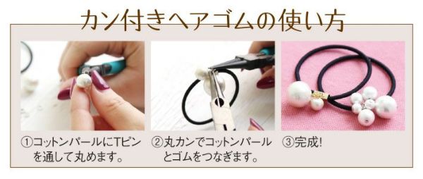 カン付なので丸カンを使用し、お好みのパーツを付けてオリジナルのヘアゴムをハンドメイドしていただけます。