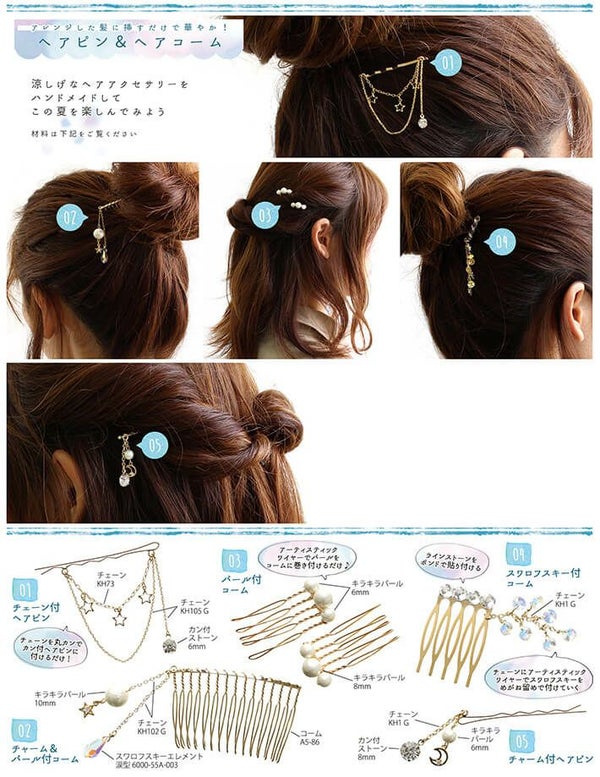 カン付きなのでビーズやパール、チェーンなどをつなぐことが出来るヘアピンです。