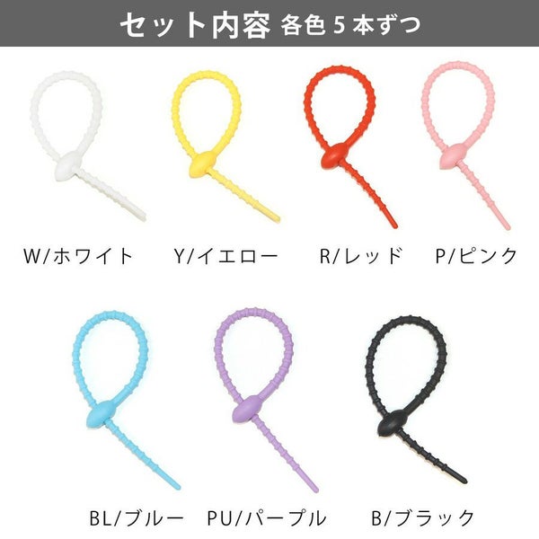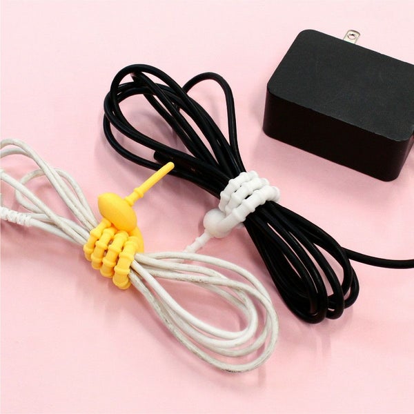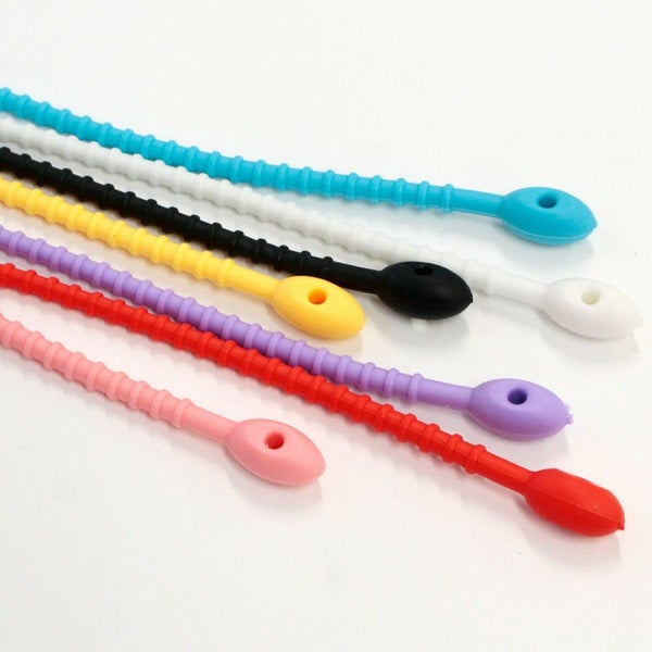 やわらかいシリコン素材で扱いやすく、巻きつけて先端を穴に通すだけで固定できます。繰り返し使えるので、使い捨ての結束バンドよりも経済的です。