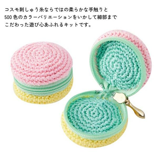 【キット内容】・刺しゅう糸 ・ファスナー ・わた ・包みボタン ・ボールチェーン ・作り方説明書 ※使用するあみ針:2/0号かぎ針