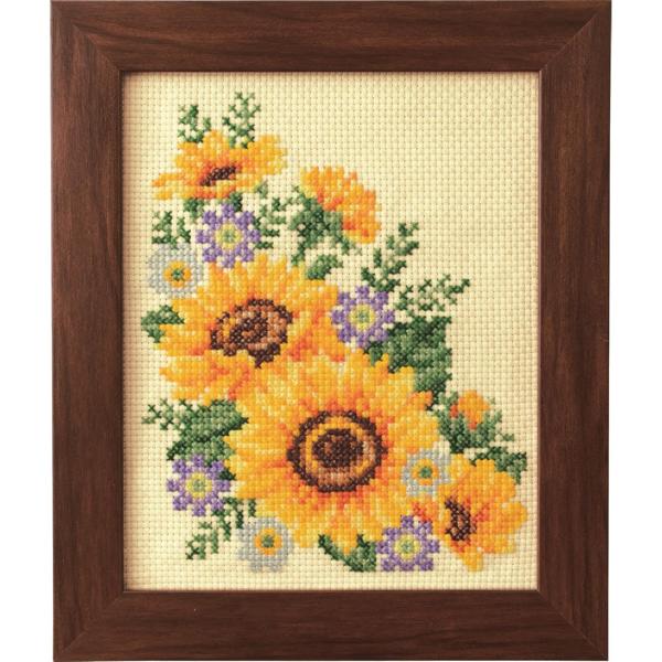 夏を感じる鮮やかなひまわりと紫の小ぶりな都忘れが可愛らしいクロスステッチです。