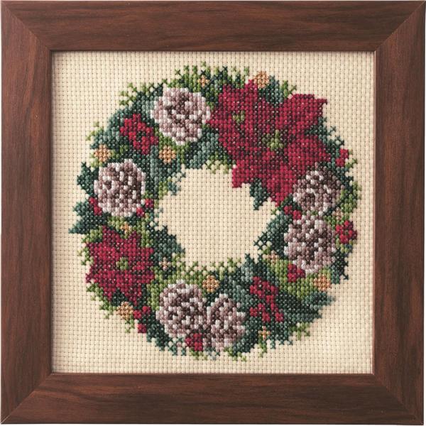真っ赤なポインセチアとまつぼっくりのリースは、冬らしくクリスマスにも適したクロスステッチです。