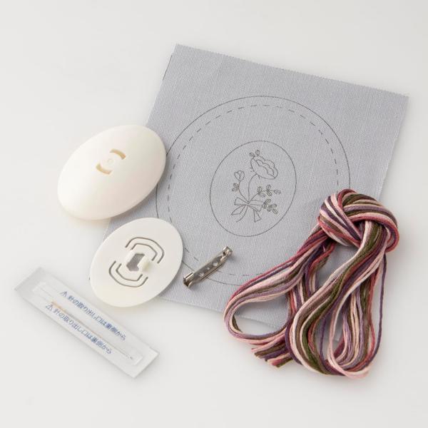 ■セット内容:刺しゅう糸、刺しゅう布(図案プリント済み)、刺しゅう針、包みボタンパーツ、ブローチピン、作り方説明書