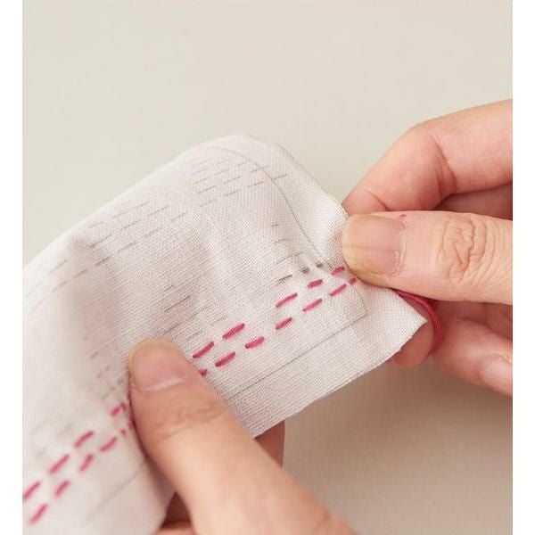 図案や仕立て用のカット線は布にプリントされているので、線の上をなぞるように刺していけば簡単に出来上がります。(線は水で消せます。)