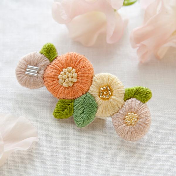 まぁるいお花とすっきりしたグラデーションカラーが魅力のヘアクリップがお作り頂ける刺しゅうキットです。