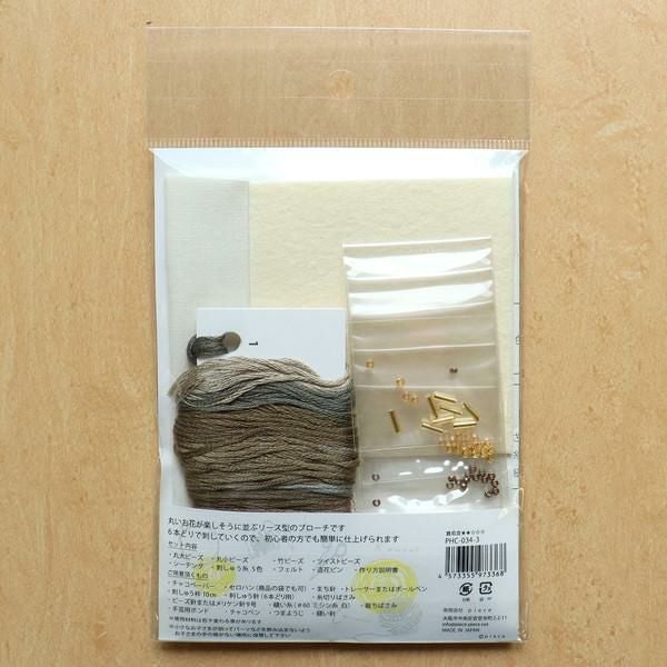 ■セット内容/丸大ビーズ、丸小ビーズ、竹ビーズ、ツイストビーズ、シーチング、刺しゅう糸5色、フェルト、造花ピン、作り方説明書